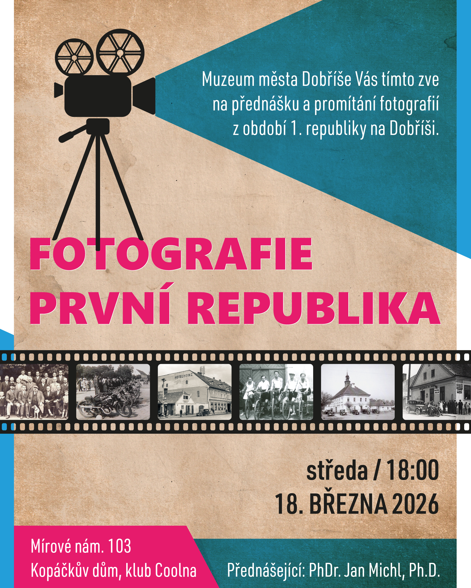 Dovolujeme si Vás pozvat na přednášku s promítáním „Prvorepubliková Dobříš“, která se bude konat ve středu 18. března 2026 od 18.00 v klubu Coolna v Kopáčkově domě. Přednášejícím bude Jan Michl, který se období 1. čs. republiky dlouhodobě věnuje. Po přednášce bude následovat autogramiáda jeho nedávno vydané knihy „Dobříš – střípky historie“. Vstupné je dobrovolné. Návštěvníci, kteří si přinesou výše uvedenou knihu k podpisu od autora, mají vstupné zdarma.